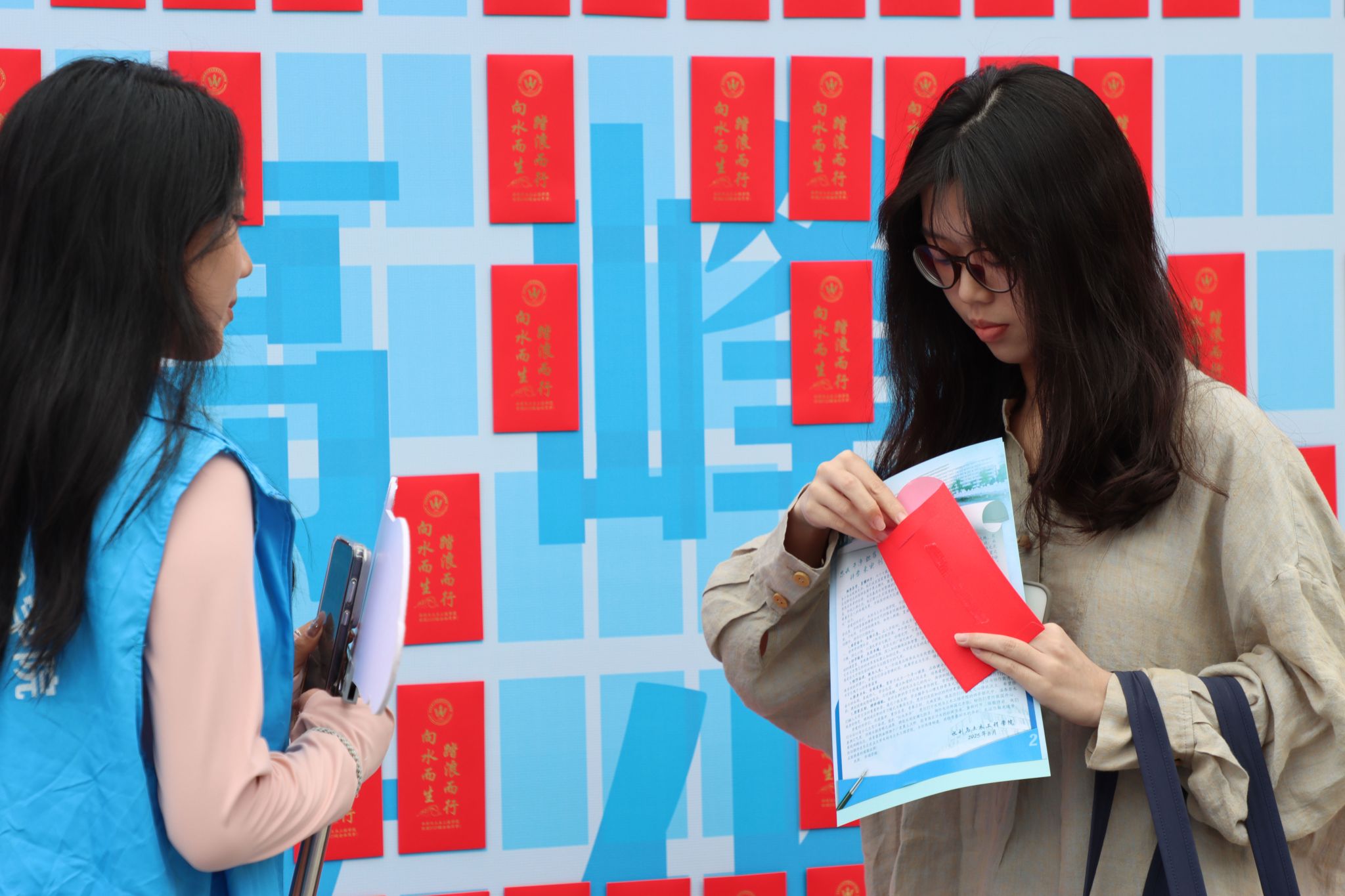学院特别设立“新生报到计数墙”,为每一位新生标记专属的“东农水利人”编号,强化身份认同与入学仪式感;创意开展“菁英助力,榜样引航”红包墙活动,组织高年级品学兼优学生与新生结对帮扶,构建一对一成长支持体系,彰显学院薪火相传的育人传统。在“礼遇萌新”上,学院推出定制U盘,内含大学期间重点难点课程学习资料、书签、明信片等一系列实用性与文化内涵并重的伴手礼,将水利与土木专业元素巧妙融入其中,兼具纪念价值与教育意义。同时,现场还陈列了多种学科实验仪器与模型,使新生提前体验专业实践氛围,激发科研兴趣与探索动力。通过视觉呈现、互动体验与心意礼赠的多维融合,营造出热烈而温馨的入学氛围,深刻体现了学院的人文关怀、创新意识和育人实效,为新生的大学之旅奠定了意义深远的开端。